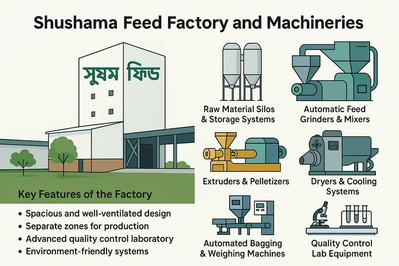 The Shushama Feed Factory is equipped with modern, automated systems that ensure high-quality poultry, fish, and cattle feed production under strict quality control. At the core of the process are the Raw Material Silos & Storage Systems, which safely store maize, soybean meal, rice bran, and other essential ingredients while protecting them from moisture and contamination. Once stored, the ingredients are processed through Automatic Feed Grinders & Mixers, where raw materials are finely ground and uniformly mixed to create balanced formulations with proteins, vitamins, and minerals. To form durable and digestible feed, the mixture is passed through Extruders & Pelletizers, advanced machines that shape the feed into floating or sinking pellets depending on poultry, fish, or cattle needs. After pelletizing, the feed is cooled and moisture-controlled using Dryers & Cooling Systems, which enhance feed shelf-life and maintain nutritional stability. The finished feed is then packed with precision using Automated Bagging & Weighing Machines, ensuring accurate weight and secure packaging for easy distribution. Finally, every batch is tested in the Quality Control Laboratory, where advanced equipment checks for protein content, moisture level, fiber, fat, and overall feed safety before reaching farmers.